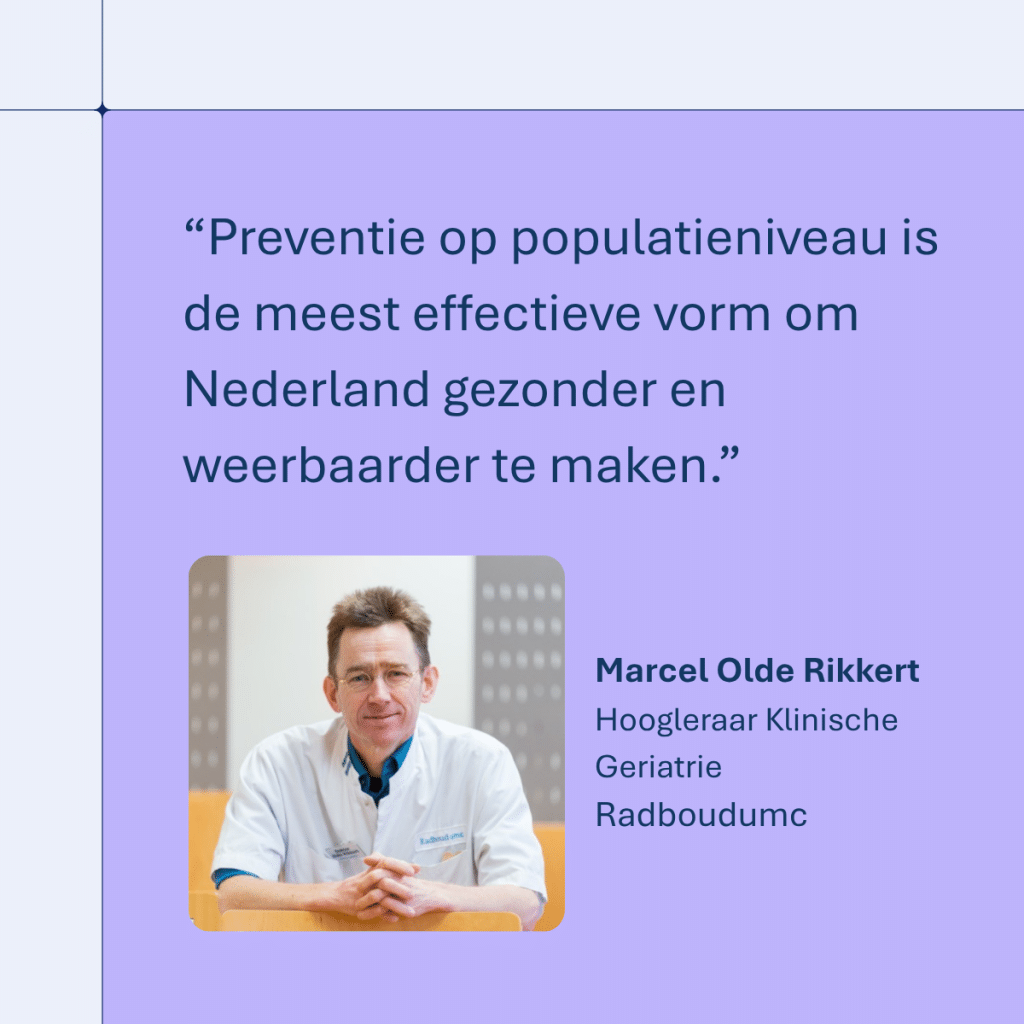 Olde Rikkert: “Preventie op populatieniveau is de meest effectieve vorm om Nederland gezonder en weerbaarder te maken. De paradox is dat we nu meer bereiken met maatregelen voor grote groepen met een laag risico dan met maatregelen voor kleine groepen met een hoog risico.”