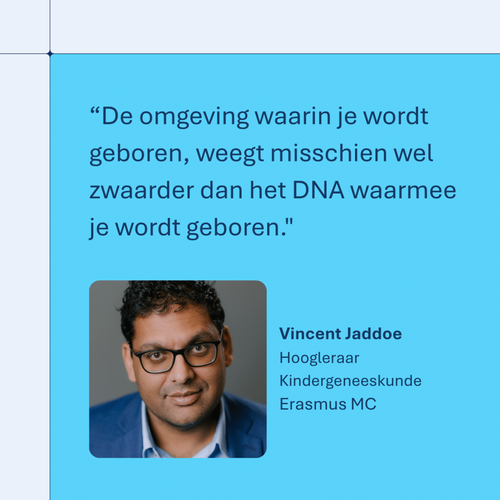 Of iemand een gezonde leefomgeving heeft, hangt ook af van diens wijk, straat en sociale context. Jaddoe: “De omgeving waarin je wordt geboren weegt misschien wel zwaarder dan het DNA waarmee je wordt geboren. Sociale achterstand vertaalt zich bijvoorbeeld in andere ziekte-uitkomsten. Nobelprijswinnaar James Heckman heeft aangetoond dat de eerste vier jaar van een kind bepalen hoe waardevol hij wordt voor de samenleving. Voorkennis van taal hangt bijvoorbeeld samen met je baan en sociale participatie later in het leven. Scholing en het aanpakken van kansenongelijkheid zie ik dan ook als een belangrijke politieke verantwoordelijkheid.”