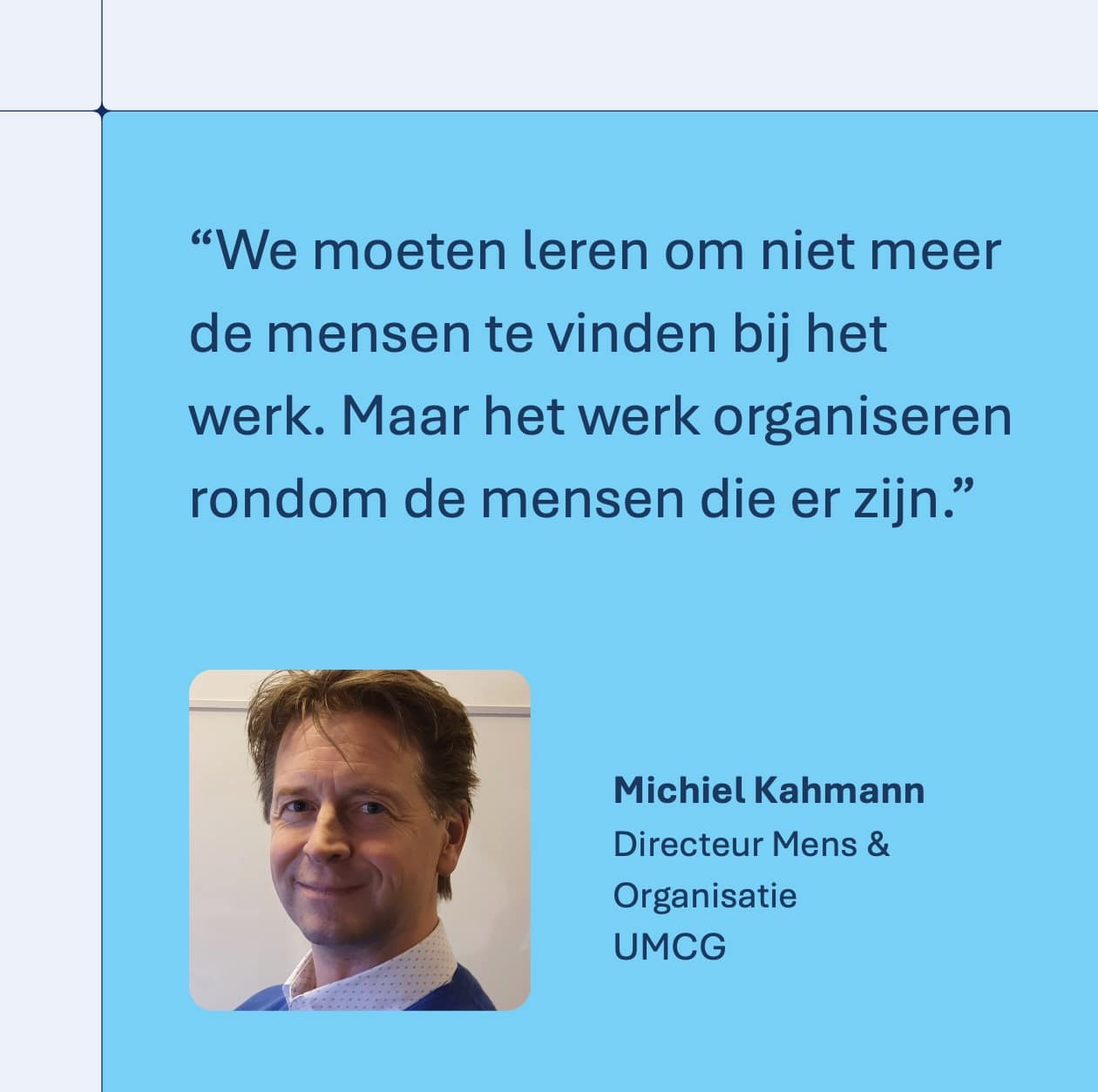 Hij vervolgt: “We moeten leren om niet meer de mensen te vinden bij het werk dat we hebben. Het nieuwe uitgangspunt is: we gaan het werk organiseren rondom de mensen die er zijn. Dat betekent bijvoorbeeld: ervoor zorgen dat mensen niet per definitie een einddiploma nodig hebben, maar beschikken over de deelcertificaten en bekwaamheden voor de taken die ze gaan uitvoeren. En dat mensen vanuit een andere branche makkelijker kunnen overstappen naar ons.”