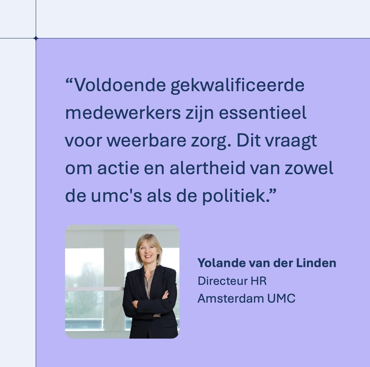 Met hun unieke kruisbestuiving tussen academische zorg, wetenschappelijk onderzoek en hoogwaardige opleidingen vergroten de universitair medische centra (umc’s) de weerbaarheid van onze maatschappij. Wil Nederland deze waardevolle combinatie in stand houden, dan is het zaak over voldoende gekwalificeerde medewerkers te blijven beschikken. “Dit vergt actie en alertheid van zowel de umc’s als de politiek”, zeggen Yolande van der Linden en Michiel Kahmann. Zij zijn respectievelijk directeur HR binnen Amsterdam UMC en directeur Mens & Organisatie bij het Universitair Medisch Centrum Groningen.